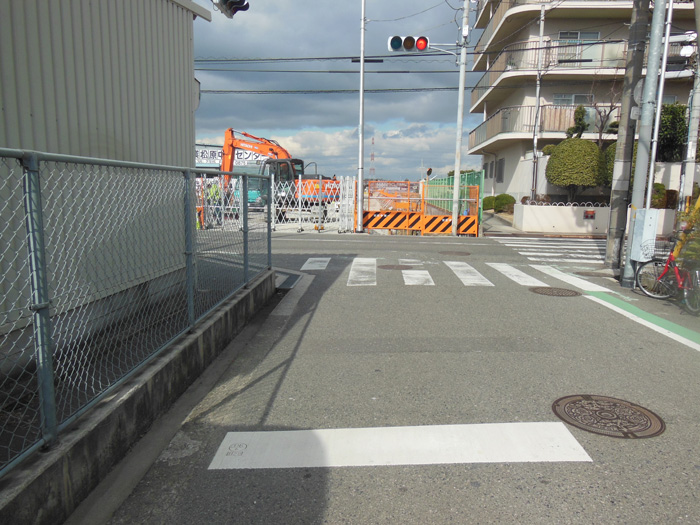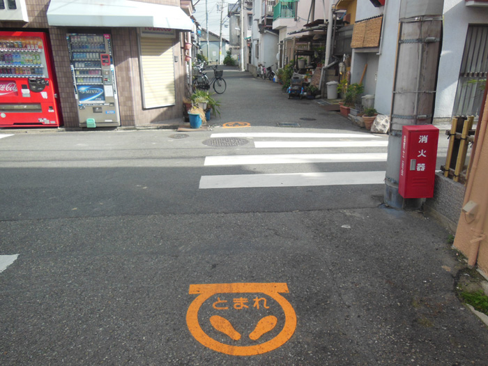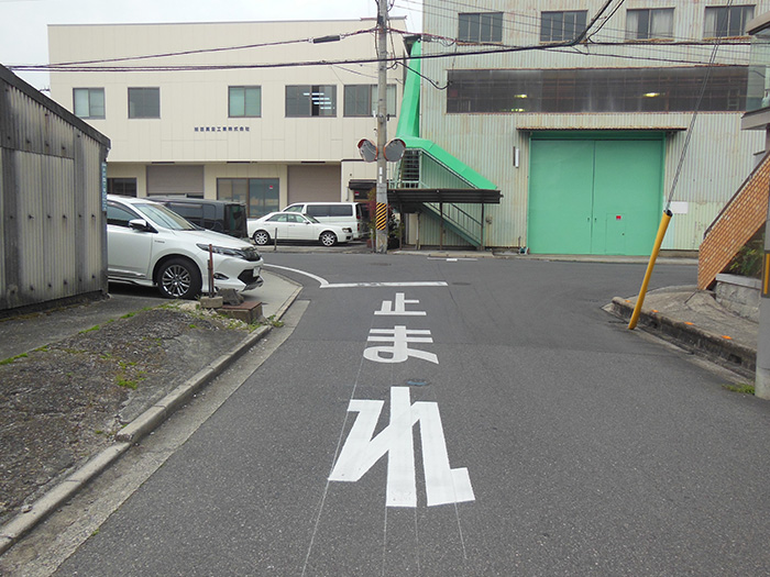 天美南2-85-1付近交差点に、安全確保のためストップマークを南北に2ヵ所付けさせていただきました。