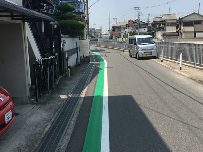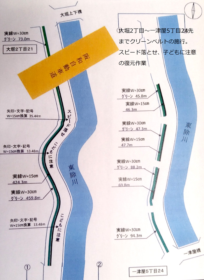 大堀2丁目21-5~一津屋5丁目24先まで、通学路安全確保のため、グリーンベルトの整備及び、こどもに注意・スピード落とせの復元をさせていただきました。